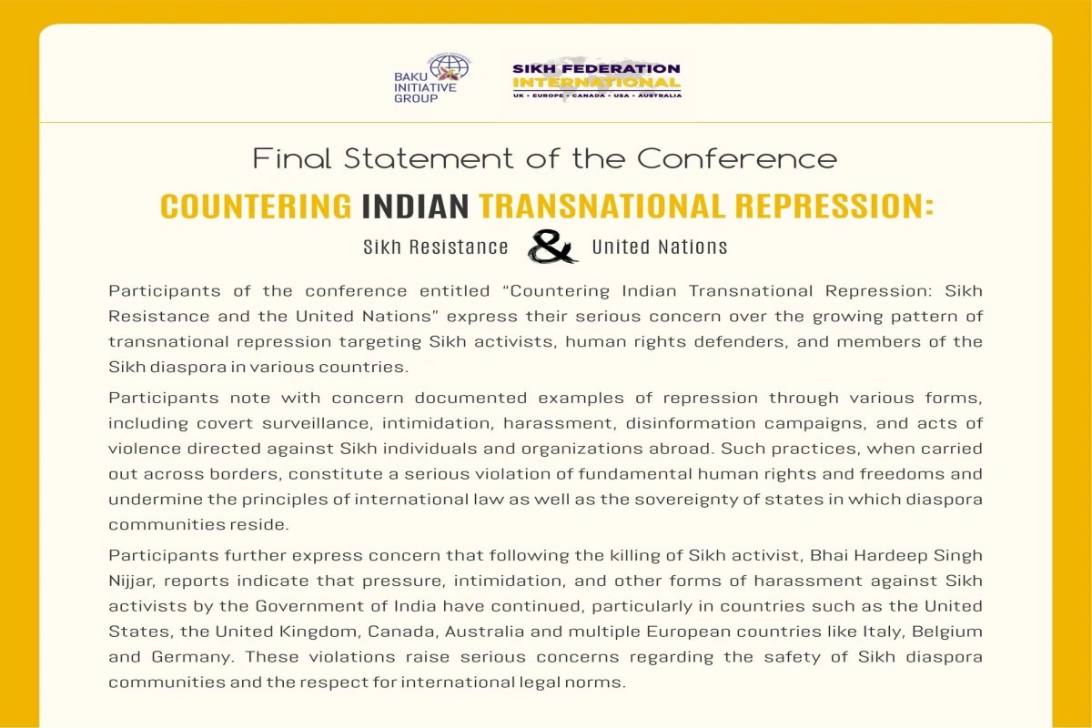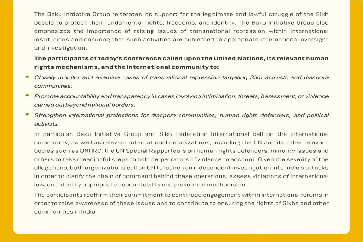 “Hindistan hökumətinin transmilli repressiyalarına qarşı mübarizə: Zixlərin müqaviməti və BMT” mövzusunda keçirilən beynəlxalq konfransın iştirakçıları müxtəlif ölkələrdə fəaliyyət göstərən zix icmasının fəallarına, insan hüquqları müdafiəçilərinə və diaspor nümayəndələrinə qarşı təzyiq halları ilə bağlı narahatlıqlarını ifadə ediblər.