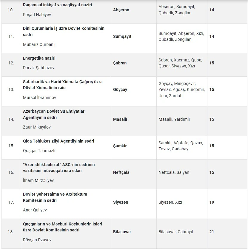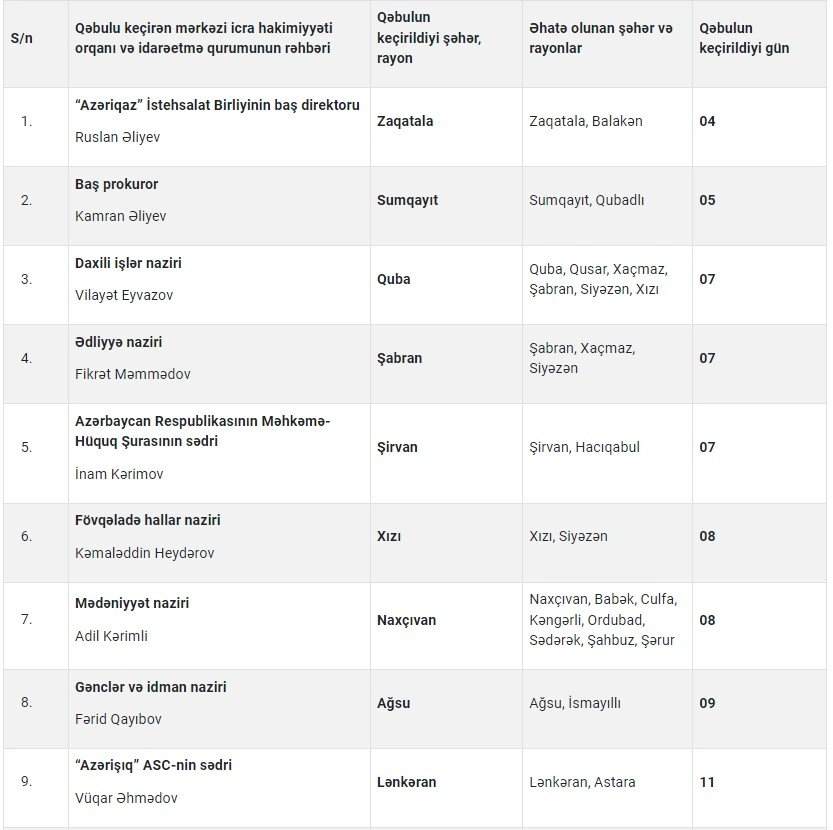 Mərkəzi icra hakimiyyəti orqanlarının və digər idarəetmə qurumlarının rəhbərləri tərəfindən 2023-cü ilin dekabr ayında şəhər və rayonlarda keçiriləcək vətəndaşların qəbulu cədvəli açıqlanıb.