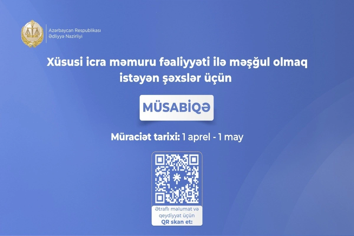 Bu barədə APA-ya Ədliyyə Nazirliyindən bildirilib. Məlumata görə, Bakı, Sumqayıt şəhərləri və Abşeron rayonu ərazisində fəaliyyət göstərəcək xüsusi icra məmurları vəzifələri üzrə müsabiqədə iştirak üçün ərizələrin qəbulu 2026-cı il aprel ayının 1-dən may ayının 1-i saat 23:59-dək aparılacaq.