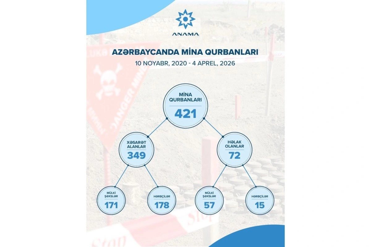 Bildirilib ki, statistikaya əsasən, Azərbaycanda 10 noyabr 2020-ci ildən mina qurbanlarının sayı 421 nəfərdir. Onlardan 72 nəfəri ölüb, 349 nəfəri xəsarət alıb. Ölənlərin 57 nəfəri mülki şəxs, 15-i isə hərbçidir. Xəsarət alanlardan isə 171 nəfəri mülki şəxs, 178 nəfəri hərbçidir.