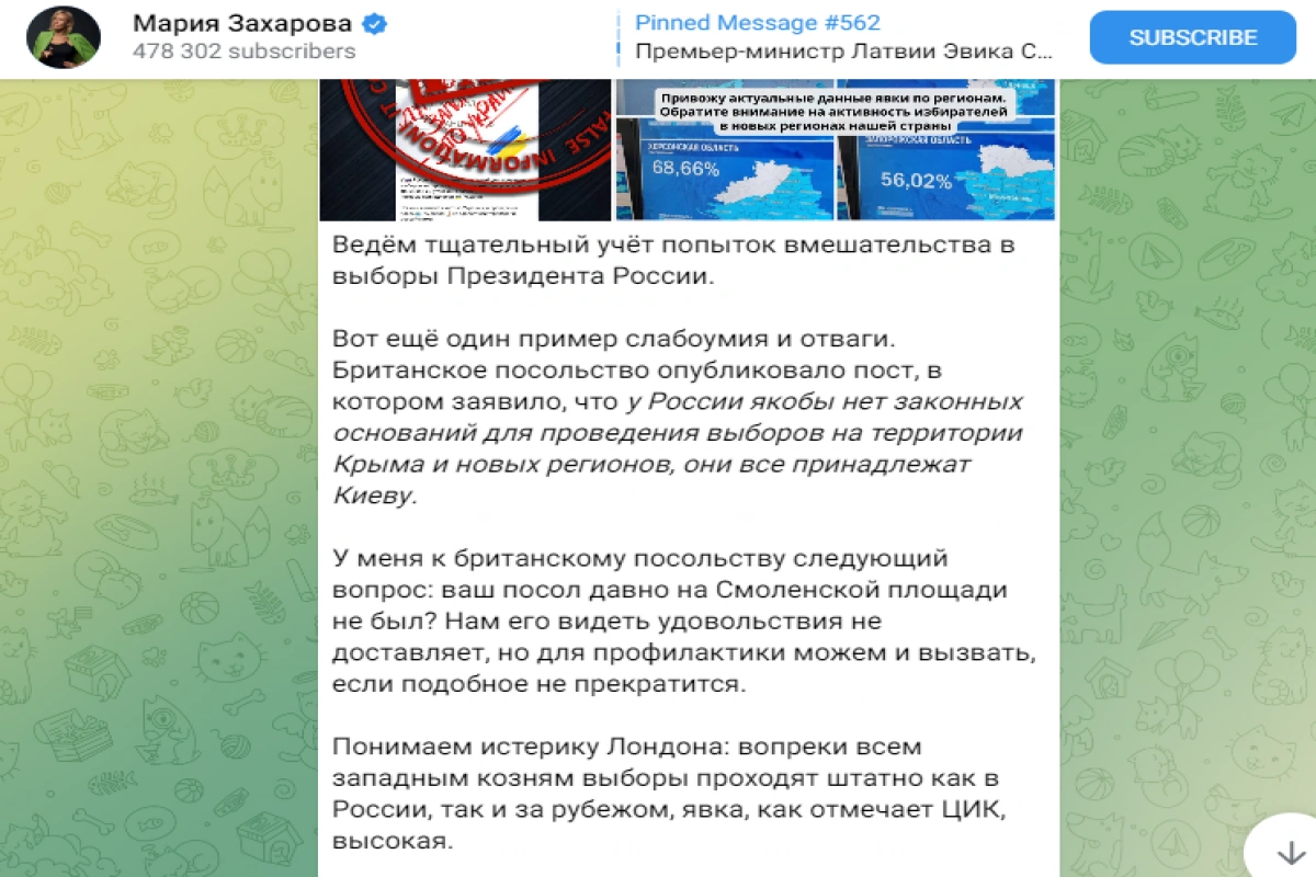 Zaxarovanın şərhinə səbəb Böyük Britaniya səfirliyinin Krım, “LPR”, “DXR”, Zaporojye və Xerson vilayətlərində Rusiya prezident seçkilərində səsvermə ilə bağlı bəyanatı olub.