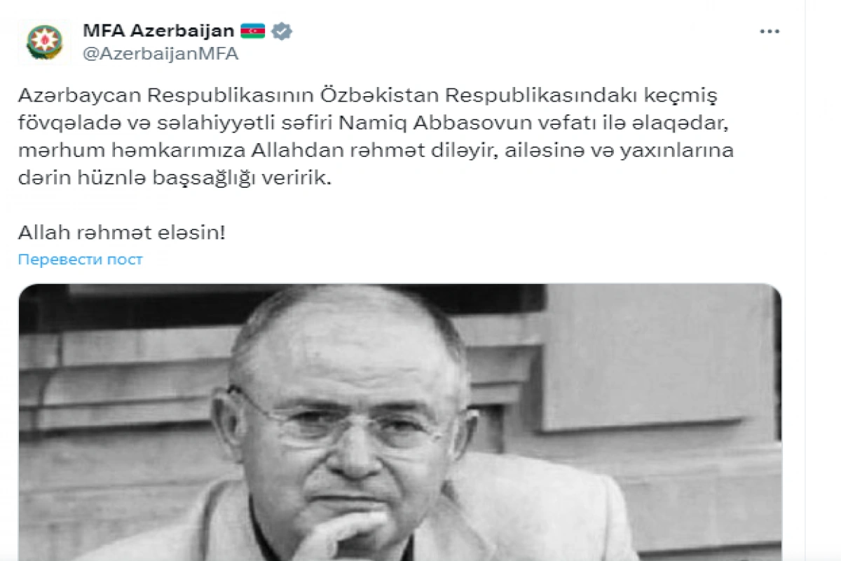 “Azərbaycan Respublikasının Özbəkistan Respublikasındakı keçmiş fövqəladə və səlahiyyətli səfiri Namiq Abbasovun vəfatı ilə əlaqədar, mərhum həmkarımıza Allahdan rəhmət diləyir, ailəsinə və yaxınlarına dərin hüznlə başsağlığı veririk. Allah rəhmət eləsin!”.