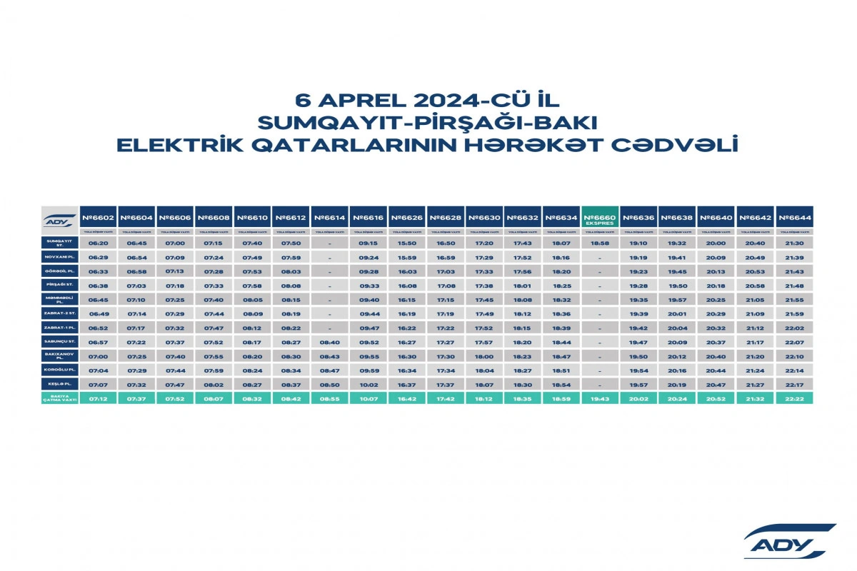 ADY-dən "APA-Economics"ə verilən məlumata görə, həftəiçi Bakı–Pirşağı–Sumqayıt istiqamətində saat 09:30-da, saat 10:00-da və saat 14:50-də, Sumqayıt–Pirşağı–Bakı istiqamətində isə saat 10:00-da, saat 10:45-də və saat 12:00-da, həftənin şənbə, bazar və qeyri-iş günlərində Bakı–Pirşağı–Sumqayıt istiqamətində saat 11:35-də, saat 15:30-da və saat 17:40-da, Sumqayıt–Pirşağı–Bakı istiqamətində isə saat 12:10-da, saat 15:25-də və saat 16:35-də yola düşən qatarların hərəkəti sentyabr ayına kimi müvəqqəti dayandırılır.