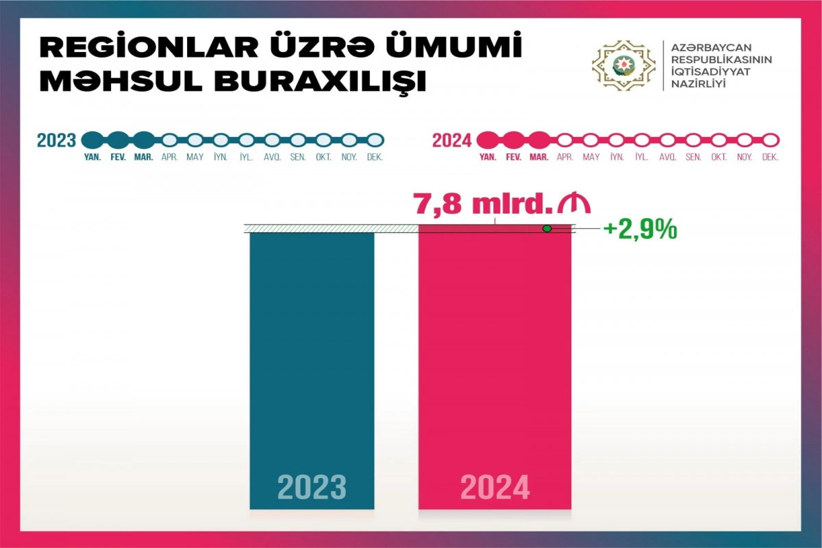 2024-cü ilin yanvar-mart ayları ərzində Azərbaycanda regionlar üzrə ümumi məhsul buraxılışı ötən ilin eyni dövrü ilə müqayisədə 2,9% artaraq (nominal ifadədə) 7,8 milyard manat təşkil edib.