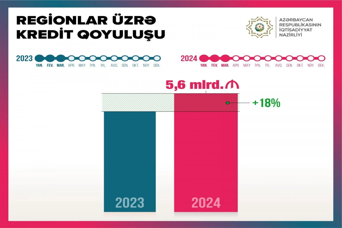 Məlumata görə, cari ilin yanvar-mart aylarında regionlara kredit qoyuluşu 18% artaraq 5,6 milyard manat, əsas kapitala investisiyalar isə 1,7 milyard manat təşkil edib.
