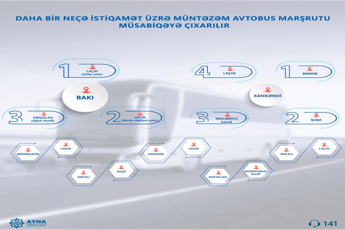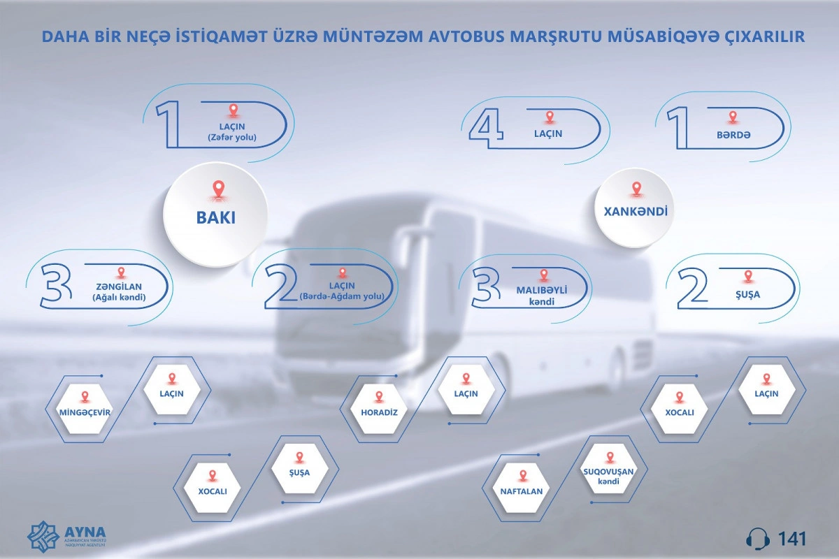 Azərbaycan Yerüstü Nəqliyyat Agentliyi (AYNA) sərnişindaşıma xidmətinin keyfiyyətinin artırılması ilə bağlı tədbirlər çərçivəsində Bakı-Zəngilan, Bakı-Laçın, Mingəçevir-Laçın, Horadiz-Laçın, Xocalı-Laçın, Xankəndi-Laçın, Xankəndi-Bərdə, Xankəndi-Malıbəyli, Xankəndi-Şuşa, Xocalı-Şuşa, Naftalan-Suqovuşan şəhərlərarası və rayonlararası avtobus marşrutlarını müsabiqəyə çıxarır.