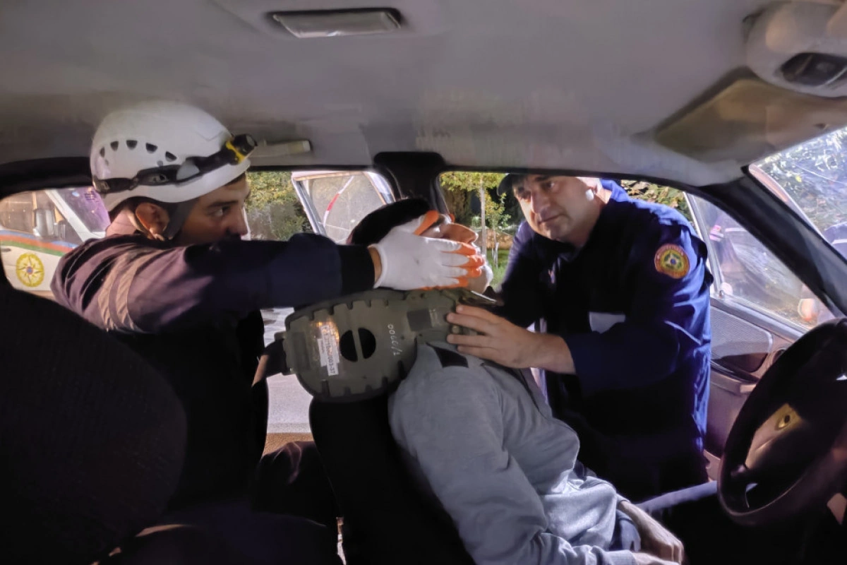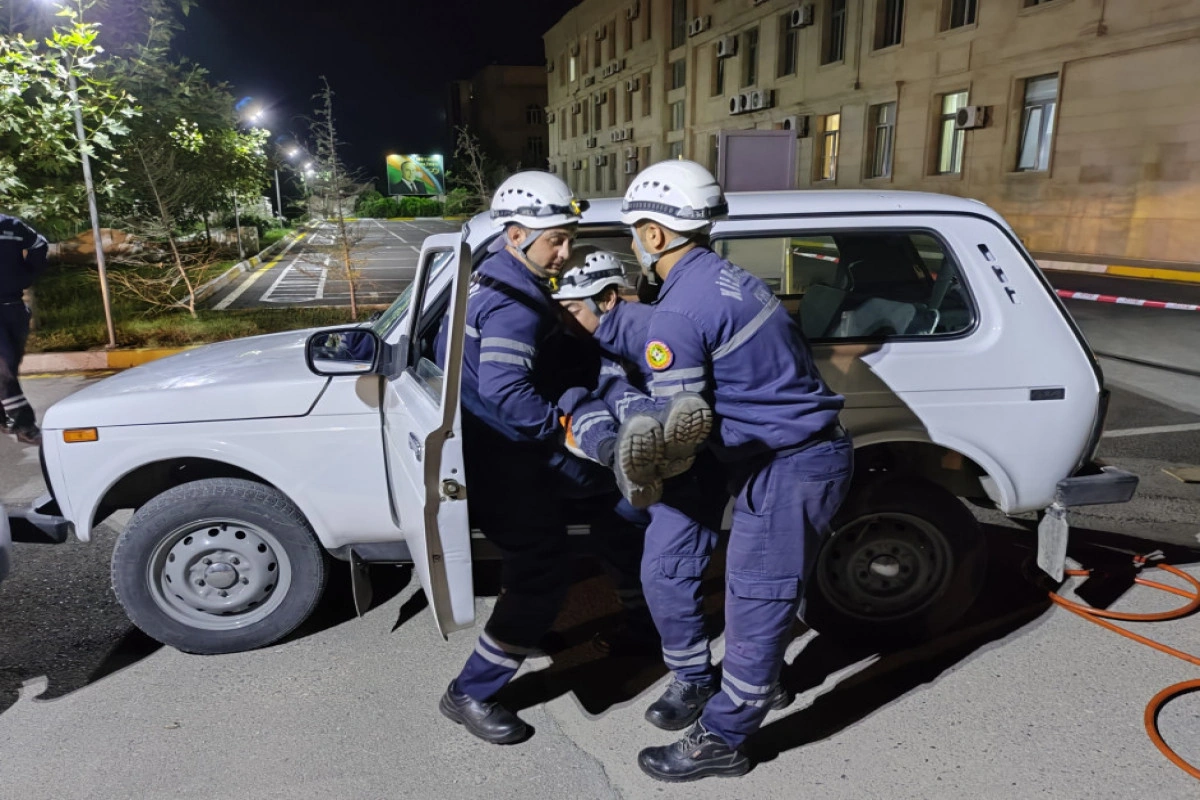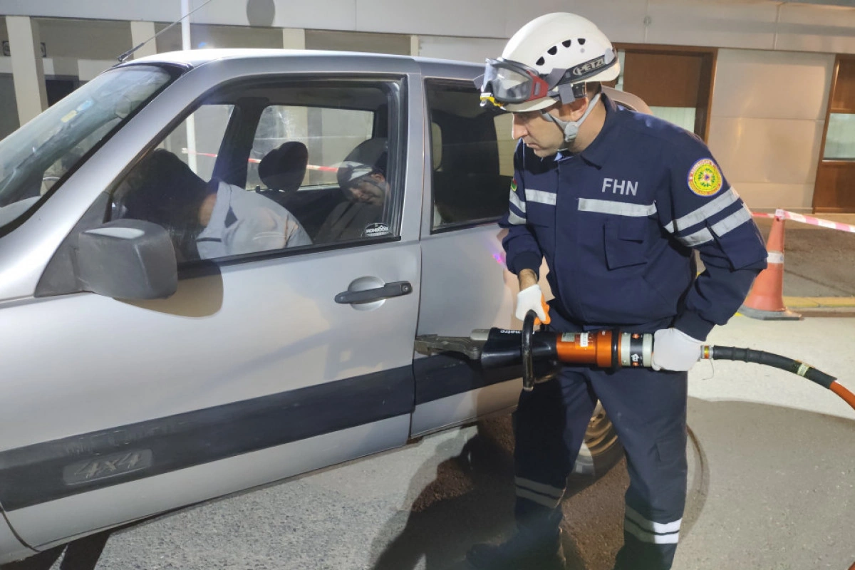 Təlim zamanı şərti olaraq baş vermiş nəqliyyat qəzası ilə əlaqədar “hadisə yerinə” operativ çatan xilasedicilər xüsusi xilasetmə vasitələrindən istifadə etməklə deformasiyaya uğramış avtomobildən “zərərçəkmişləri xilas edərək” onlara “təxirəsalınmaz ilkin yardım göstəriblər”.