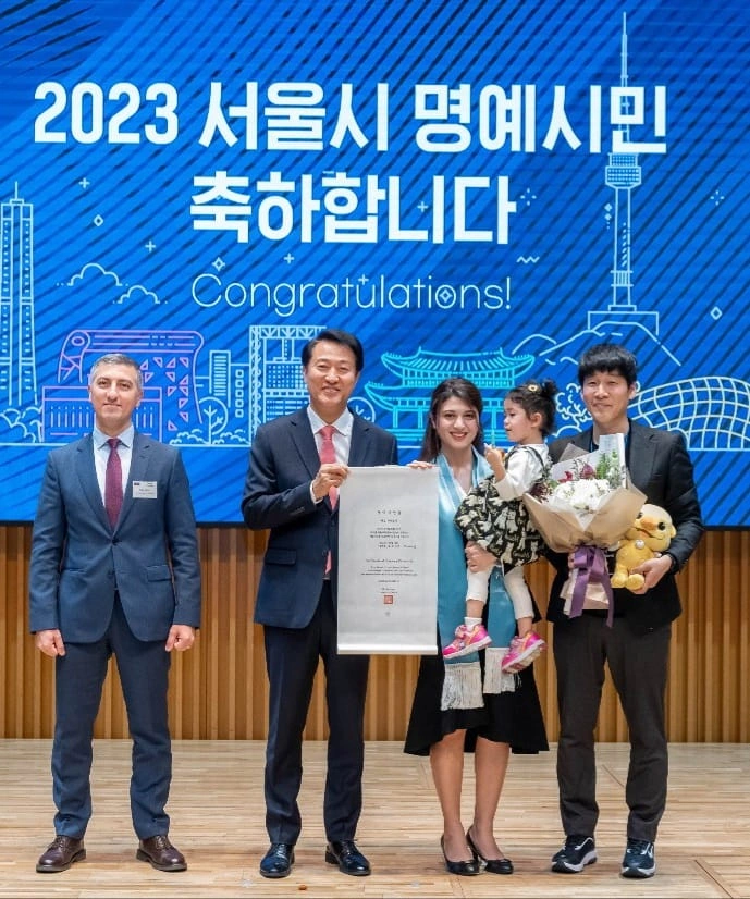 Təntənəli mükafatlandırma mərasimində Seul meri Oh Se-hoon soydaşımıza fəxri vətəndaş medalını və sertifikatını təqdim edib.