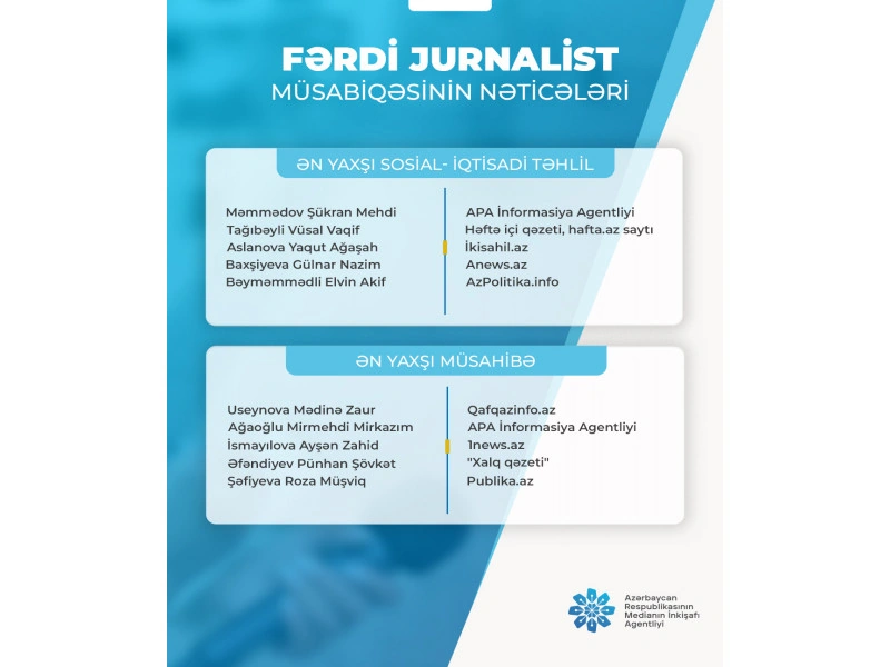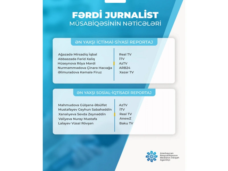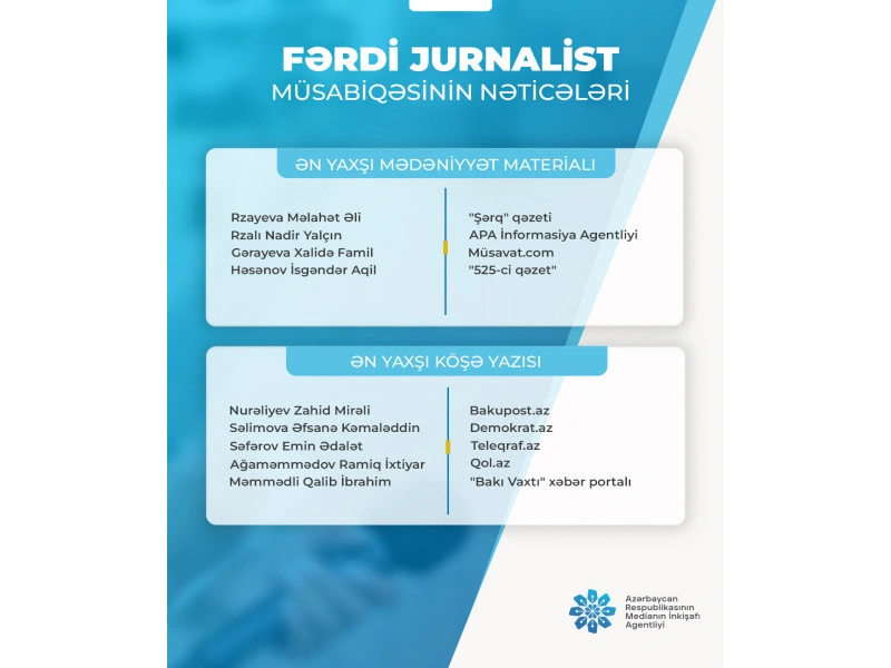 Azərbaycan Respublikasının Medianın İnkişafı Agentliyi tərəfindən 30 oktyabr 2025-ci il tarixində elan olunmuş "Fərdi jurnalist müsabiqəsi"nin nəticələri açıqlanıb.