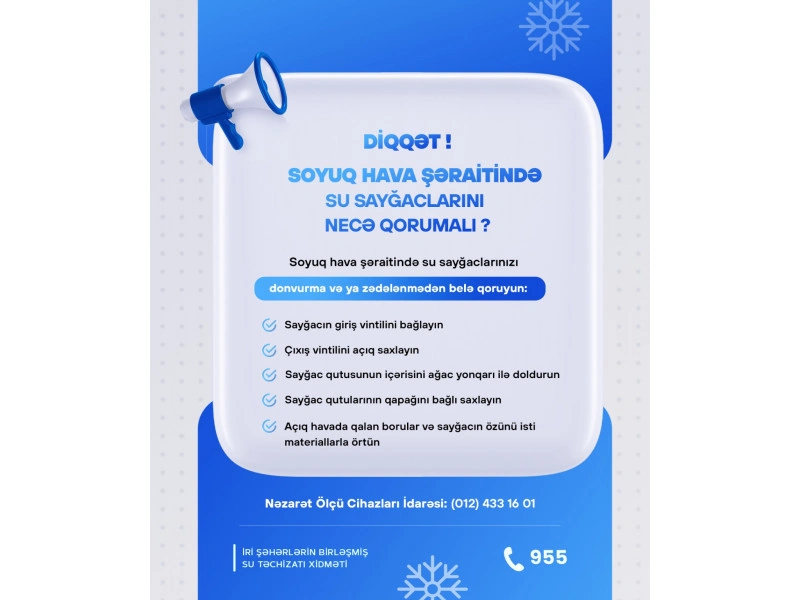 İstehlakçıların diqqətinə çatdırılıb ki, fərdi yaşayış evlərində, həyətyanı sahələrdə, kommersiya obyektlərində quraşdırılmış sayğacların şaxtalı günlərdə donvurma nəticəsində sıradan çıxmasının qarşısının alınması üçün zəruri və qabaqlayıcı tədbirlərin görülməsi vacibdir. Şaxtanın daha çox olduğu gecə saatlarında sayğac içərisində suyun qalmamasına görə sayğacın giriş vintili bağlanmalı, çıxış vintili açıq saxlanılmalı, sayğac qutusunun qapağı bağlı qalmalıdır. Donvurmadan mühafizə tədbirləri məqsədilə açıq havada qalan boruları, sayğacın özünü isti materiallarla örtmək, qutunun içərisini ağac yonqarı ilə doldurmaq vacibdir.