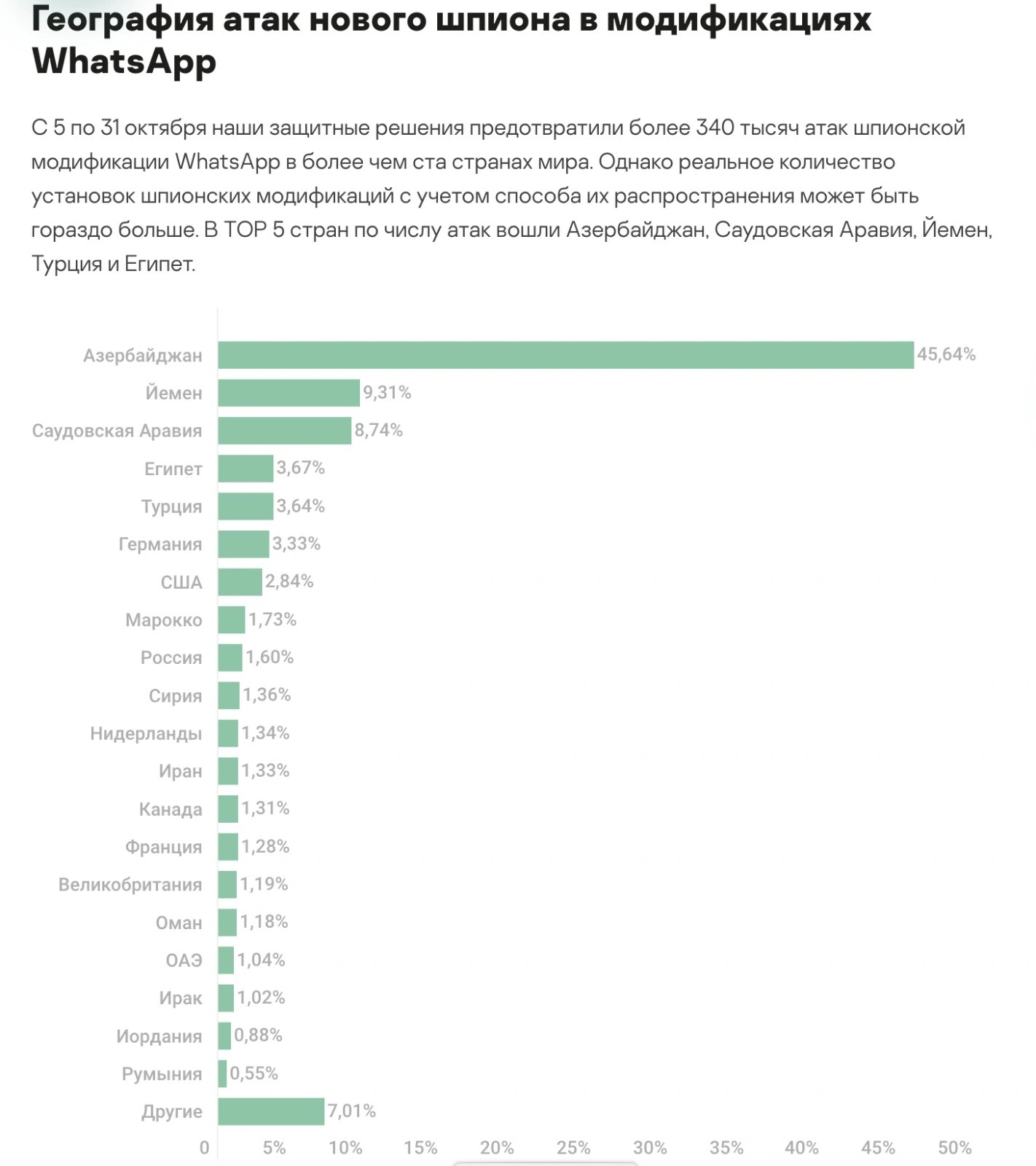“Təəssüflə bildirmək lazımdır ki, Xüsusi Rabitə və İnformasiya Təhlükəsizliyi Dövlət Xidmətinin Kompüter İnsidentlərinə Qarşı Mübarizə Mərkəzinin 26 aprel 2021-ci il tarixində (https://t.me/certgovaz/12) etdiyi xəbərdarlığa baxmayaraq saxta “Whatsapp” tətbiqlərinin istifadəsi vətəndaşlar arasında artmaqda davam edir. Bunu “Kaspersky Laboratoriya”sının oktyabr 2023-cü il tarixi üçün təqdim etdiyi araşdırmadan da aydın görmək olur. Belə ki, təqdim edilən araşdırmada Azərbaycan vətəndaşlarının saxta “Whatsapp” tətbiqi yükləyənlərin sayına görə 45,64% ilə regionda ilk yerdə olması vətəndaşlar üçün kibergigiyena kimi maarifləndirmə tədbirlərinin genişləndirilməsinə ciddi ehtiyac olduğundan xəbər verir” - məlumatda qeyd olunur.