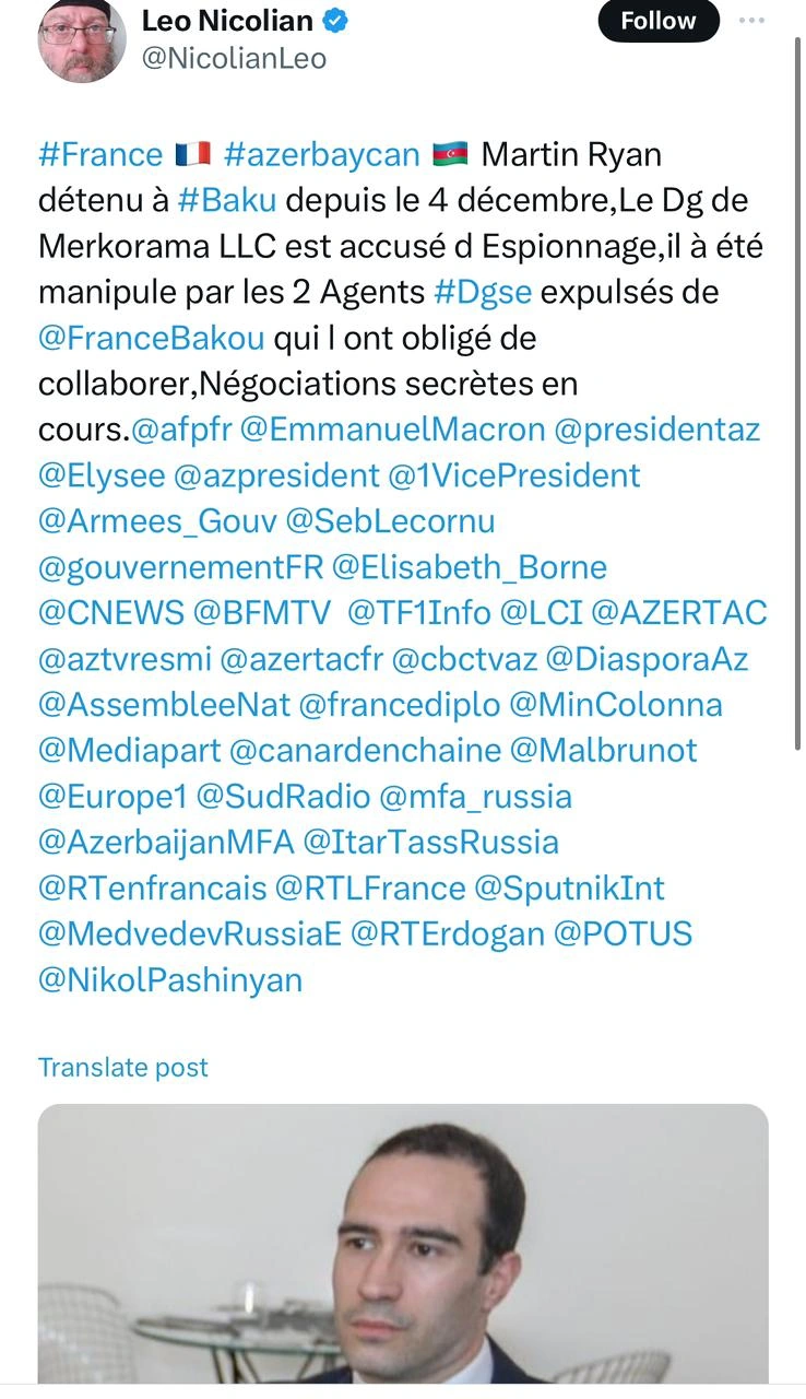 “Qafqazinfo” xəbər verir ki, bu barədə məlumatı erməniəsilli fransız jurnalist Leo Nicolian öz “X” hesabında paylaşıb.