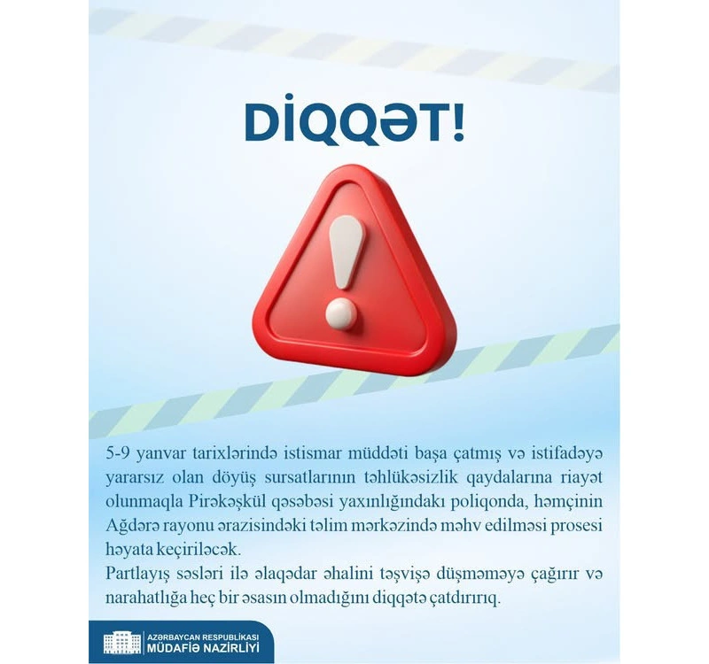 5-9 yanvar tarixlərində istismar müddəti başa çatmış və istifadəyə yararsız olan döyüş sursatlarının təhlükəsizlik qaydalarına riayət olunmaqla Pirəkəşkül qəsəbəsi yaxınlığındakı poliqonda, həmçinin Ağdərə rayonu ərazisindəki təlim mərkəzində məhv edilməsi prosesi həyata keçiriləcək.