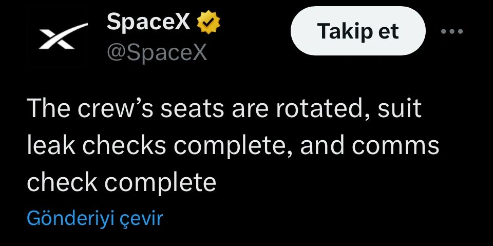“Qafqazinfo” xəbər verir ki, bu “SpaceX” bu gecə Türkiyə vətəndaşı Alper Gezeravcı da olduğu 4 nəfərlik heyətin səfərə hazırlıqlarının yekunlaşdığına dair açıqlamada qeyd olunub:
