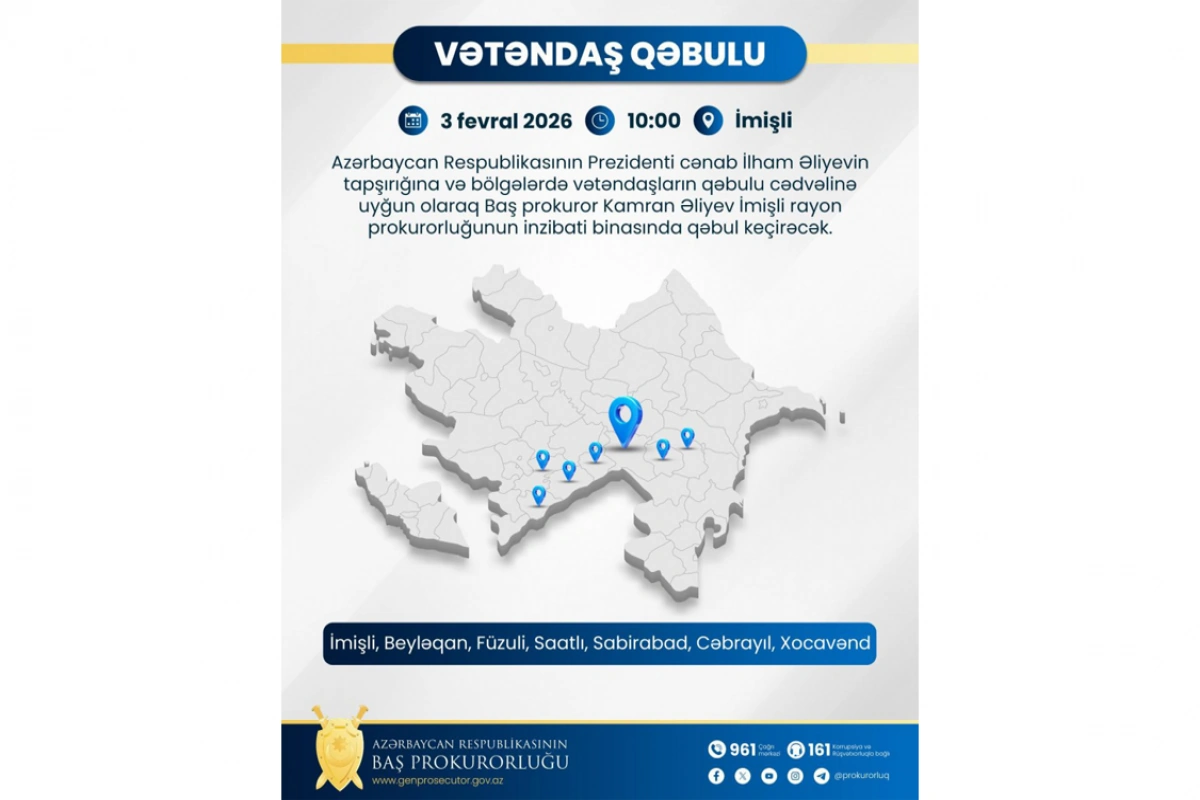 Bildirilib ki, Prezident İlham Əliyevin tapşırığına və bölgələrdə vətəndaşların qəbulu cədvəlinə uyğun olaraq Baş prokuror Kamran Əliyev fevralın 3-də, saat 10:00-da İmişli rayon prokurorluğunun inzibati binasında İmişli, Beyləqan, Füzuli, Saatlı, Sabirabad, Cəbrayıl və Xocavənd rayon sakinlərinin qəbulunu keçirəcək.