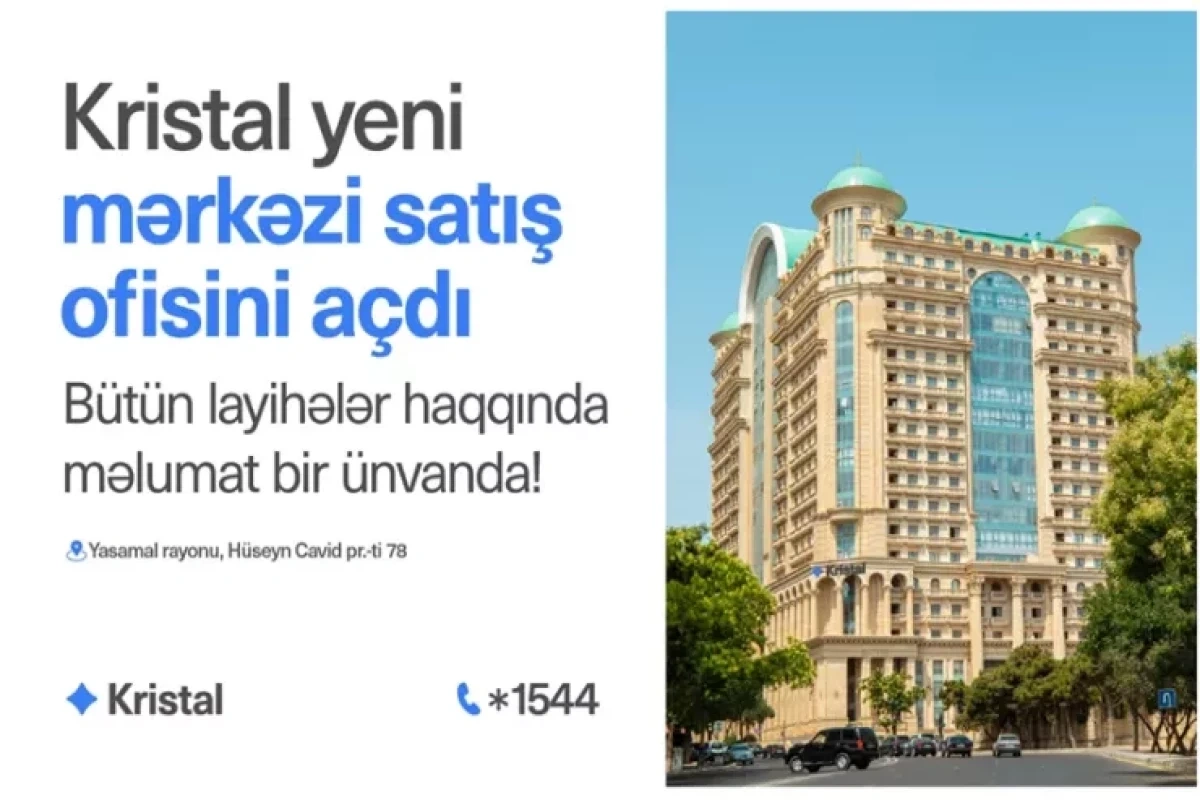 "Kristal" müştərilər üçün daha rahat və çevik xidmət imkanları yaratmaq məqsədilə yeni Mərkəzi satış ofisini istifadəyə verib. Ofis "Elmlər Akademiyası" metro stansiyası yaxınlığı, Hüseyn Cavid prospekti 78, "Merida Premium" layihəsində yerləşir.