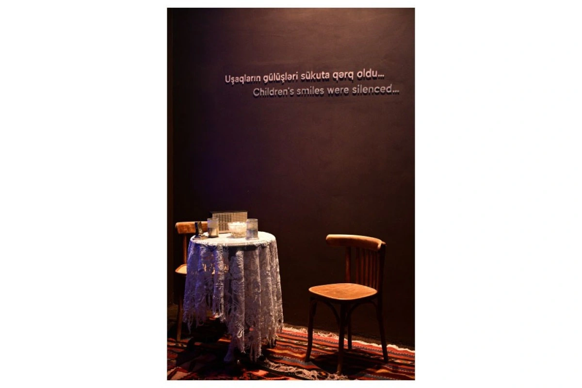 İkinci ekspozisiya zalında Sərxan Hacıyevin “Bir gecənin içində səssiz qalan evlər” instalyasiyası və faciə zamanı tamamilə məhv edilmiş 8 ailənin taleyi, insanlıq əleyhinə yönəlmiş cinayət nəticəsində bir gecədə yarımçıq qalan həyatlar, arzular, sükuta qərq olan uşaq gülüşləri süni intellektlə hazırlanan video vasitəsilə təqdim edilir.